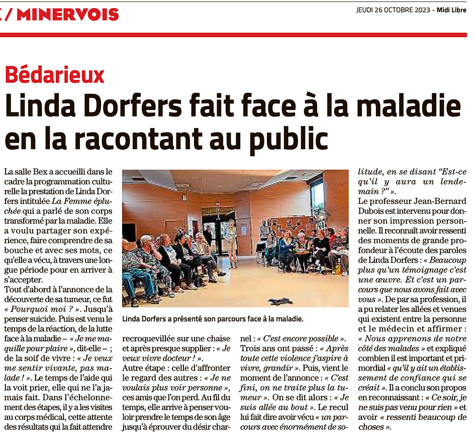 Merci pour votre sensibilité, votre poésie, votre culture littéraire, vos réflexions personnelles (...). Parce que dans votre spectacle il y a de la psychologie, de la philosophie, de la sociologie, il y a de tout, il y a plein d’attitudes que vous avez rapportées qui sont vraies, on sent la vérité derrière, le vécu, le rapporté, le non-interprété, avec beaucoup de sensibilité. Les spectateurs sont bouche-bée c’est bien ! (...) C’est une performance à la fois au sens anglais et au sens français du terme. Qu’il faudrait filmer pour la diffuser partout et atteindre le plus grand nombre.